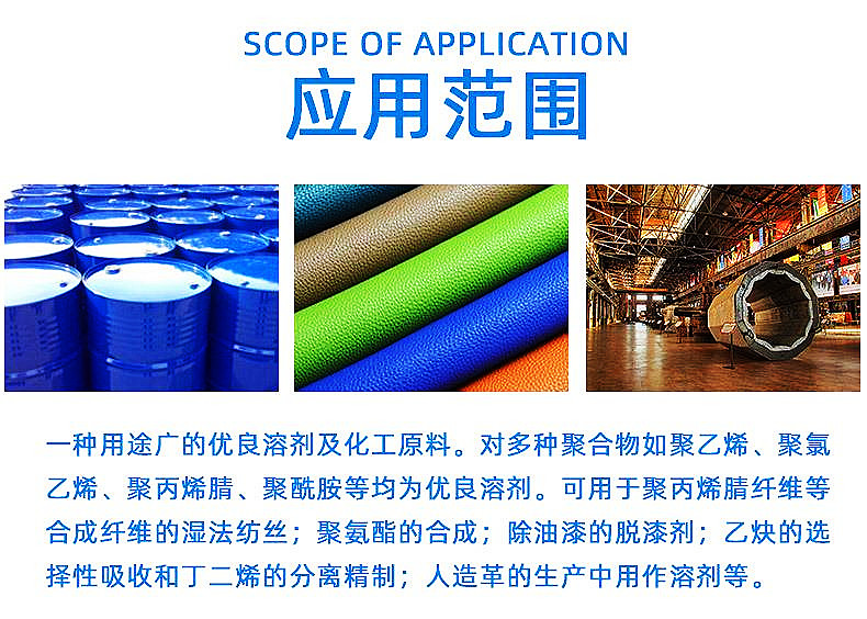 二甲基甲酰胺(DMF)是一種沸點高、凝固點低、化學和熱穩定性好的優良有機溶劑。例如,采用以DMF為溶劑的腈綸干法紡絲工藝生產出的腈綸具有疏水性好、覆蓋力強、質地柔軟、手感強等特點。在濕法聚酯合成革生產中,DMF溶液中,可用于涂布各種延伸性或絲基質材料。在染料中作溶劑,用于合成纖維染色,可提高勻染性等。 由于DMF較強的溶解能力,使之在膠片及纖維生產中特別有用。另外,它在涂料、印刷油墨及粘合劑配方中也可用作作助溶劑。例如,采用以DMF為溶劑的腈綸干法紡絲工藝生產也的腈綸具有疏水性好、覆蓋力強、質地柔軟、手感強等特點。在濕法聚酯合成革生產中,DMF可作為聚氨酯樹脂的洗滌固化劑。而用于皮革染色時,可使皮革色度均勻,不褪色。又如,將某些聚酰胺加入DMF溶液中,用于合成纖維染色,可提高勻染性等。 此外,DMF還可用作載體的溶劑,如以DMF與BF3(三氟化硼)用途形成一種聚合晶體,使BF3由氣體變成固體而易于運輸。 用于分離過程作為一種選擇性溶劑,DMF可用于各種烴類和無機氣體的選擇性吸收。如使用DMF洗滌乙烯來去除其中的乙炔,從而將乙烯提純。DMF用于C4和C5餾分的萃取蒸餾時,當使用沸點介于DMF和待分離烴沸點之間的烴類稀釋劑時,萃取蒸餾塔和洗滌塔再沸器溫度均可降低。DMF也可用于酯和醚的分離,即將DMF與其客觀存在高沸點溶劑并用,可將乙酸乙酯從乙醇/水的二元或三元共沸物中分離出來。 用于選擇性溶劑萃取作為選擇性溶劑,DMF可用于石油加工等許多領域的萃取工藝。例如:在潤滑油原料精制過程中,DMF能有效地將非鏈烷烴從鏈烷烴中萃取分離出去;在間苯二甲本和對苯二甲酸等性質相似、很難分離的多元羧酸物系中,用DMF溶劑萃取或分步重結晶,都可較容易地使之分離開來;DMF還可將三聚氰酸從含有尿素、縮二脲和三聚氰酸的酰胺粗品中萃取出來 。