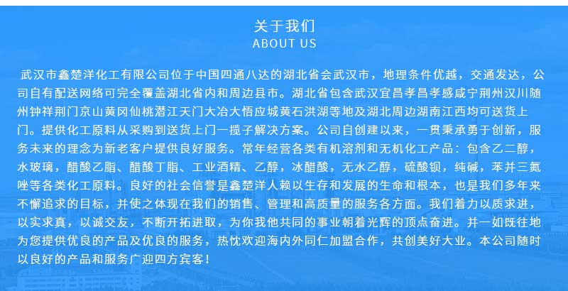 武漢市鑫楚洋化工有限公司位于中國四通八達的湖北省會武漢市,地理條件優越,交通發達,公司自有配送網絡可完全覆蓋湖北省內和周邊縣市。提供化工原料從采購到送貨上門一攬子解決方案。公司自創建以來,一貫秉承勇于創新,服務未來的理念為新老客戶提供良好服務。